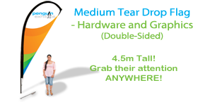 The Medium Tear Drop Flag is 4.5 meters in height and can be purchased separately as hardware (pe-medtdf) or single-sided graphics (see product pe-medtdfg) or double-sided graphics (see product pe-medtdfg2).