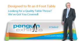 Maximize visual impact at your trade show booth, exhibition or in-store display table with a table throw. Sized to fit a standard 8ft table, the 4-Sided throw provides full length front, back and side coverage allowing for neat and tidy, hidden storage of items underneath. Table throws are constructed of printed dyesublimation fabric.