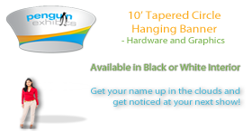 Get your name up in the clouds with the 10ft Tapered Circle Cloud Cover (height 42"). This hanging banner will get you noticed from practically anywhere in the exhibit hall. Each cloud cover is constructed of a high quality frame and fabric graphics. This product includes both hardware and graphics resulting in a 10% discount. This product is constructed with an aluminum frame, bungee cord and push clip connectors with tensioned fabric dyesublimation graphics.