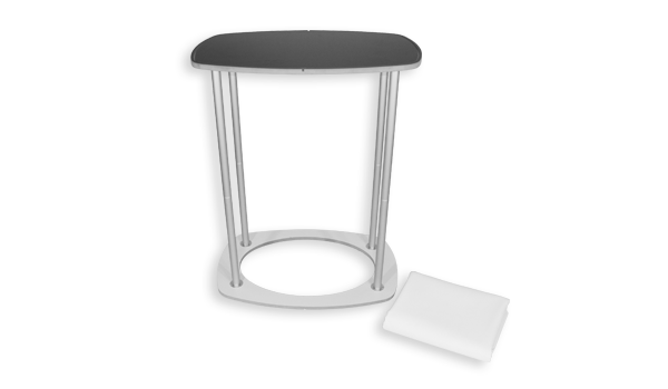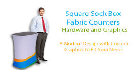 The Square Sock Box fabric counter is a sleek, simple and compact design that is ideal for exhibition use or store-front reception. The pole support panel stretches the fabric screen and connects the upper and lower panels to form the counter complete with an attractive black countertop. This lightweight product weighs no more than 25 lbs (40"h X 31.5"w). This product includes both hardware and graphics resulting in a 10% discount. This product is constructed with an aluminum frame, wooden tops and bases and tensioned fabric dyesublimation graphics.
