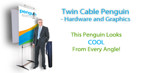 Our Standard Twin Graphic Cable Penguin is perfect for trade shows, exhibitions, store openings, specials or any event that needs a bold statement. The Standard Twin Graphic Cable Penguin is 86.25” high and is available in 4 widths from 27.5" to 39.4". Each unit includes a convenient, compact transport case.  This product includes both hardware and graphics resulting in a 10% discount.